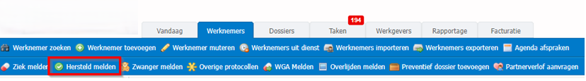 Klik in de menubalk van VerzuimSignaal op het tabblad Werknemers en vervolgens op Hersteld melden.